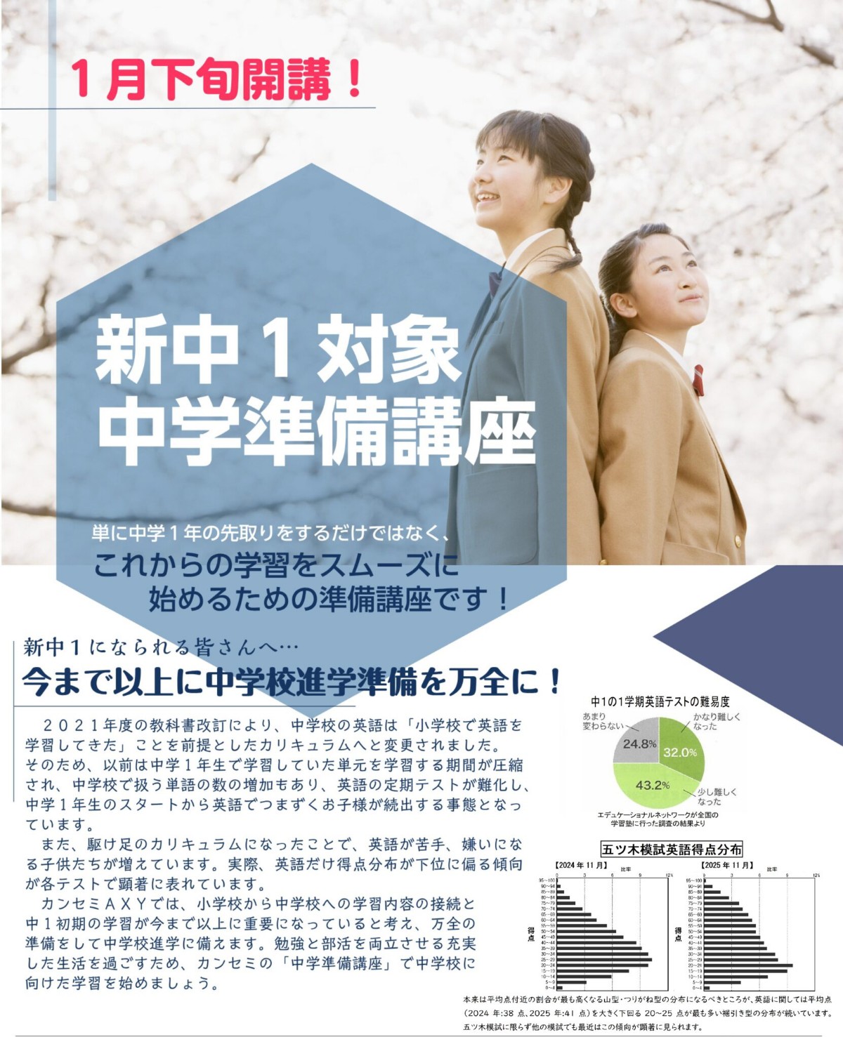 カンセミAXY富雄教室では新中学1年生を対象とした中学準備講座を1月下旬から2月下旬にかけて実施します。