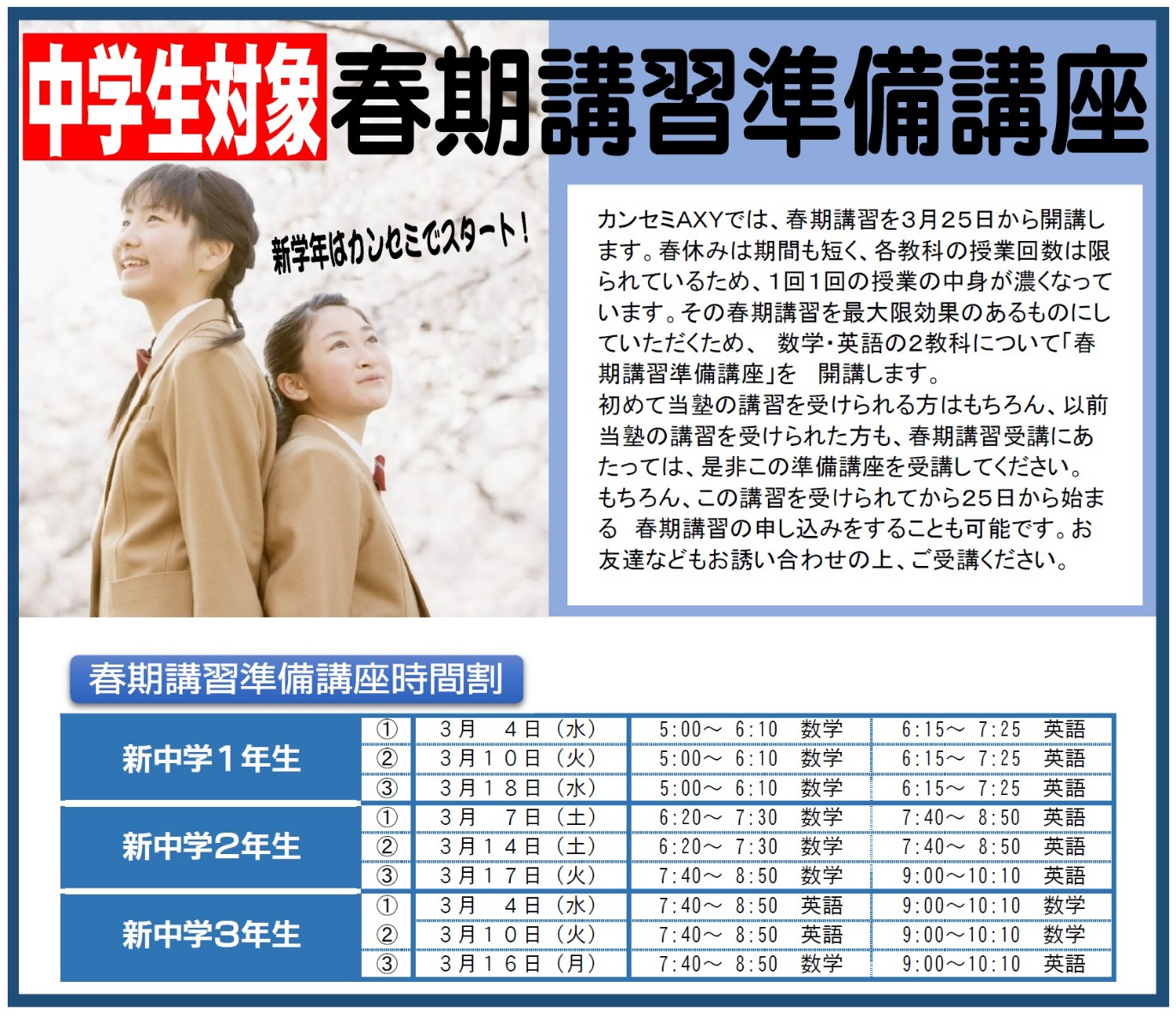 ※準備講座を受講してからの春期講習(3/25~)申し込みも可能です。春期講習受講を迷われている方は、まずはこの授業に参加して、カンセミの授業を体験してみてください。